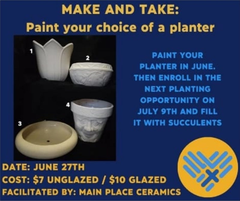 Paint your planter in June. Then enroll in the next planting opportunity on July 9th and fill it with succulents. AGES: High School and Up COST: $7 Unglazed/ $10 Glazed FACILITATED BY: Main Place Ceramics Sign Up